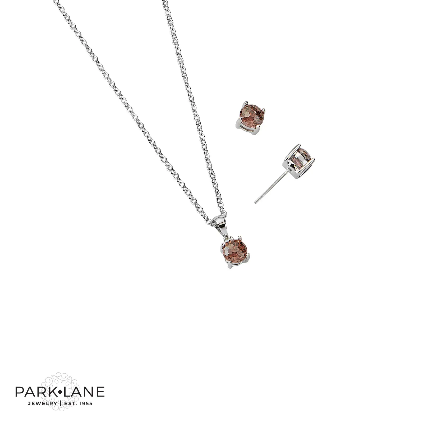 El juego incluye aretes y collar. Este conjunto está elaborado con un acabado de plata pulida y adornado con circonias marrones de 2 quilates con corte de fuegos artificiales. El collar mide 40,6 cm + 7,6 cm.